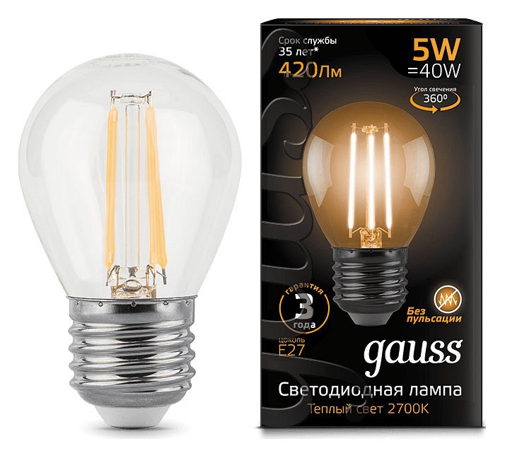 | Альтернативное название | Лампа светодиодная филаментная E27 5W 2700K прозрачная 105802105 |