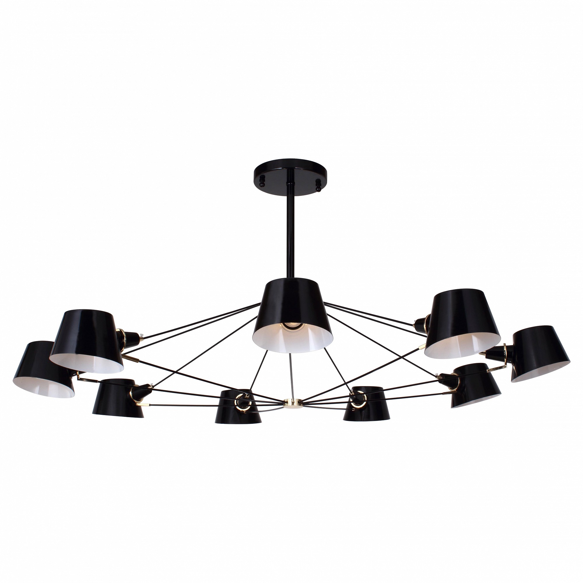 Каркас из металла черного цвета, плафоны из металла черные снаружи и белые внутри, золотые декоративные элементы, сменные лампы. Eimer – одна из самых любимых и востребованных коллекций дизайнеров. Основание черного цвета и плафоны конусной формы выполнены из металла. Направленность плафонов вниз помогает люстре освещать достаточно ярко и мягко. Декоративные элементы на плафонах в цвете золота или хрома добавляют оригинальность этим светильникам.